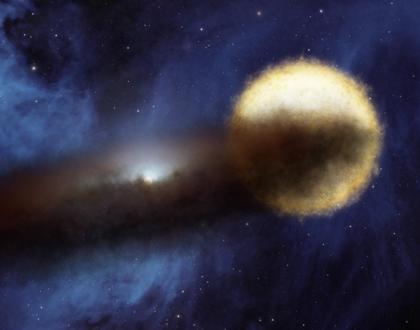 The mystery of how this happens may have been solved very recently -- in January of 2010 the theory was presented that ε Aurigae is a dying star, with twice the mass of the sun and blown up to 100 times the diameter of the sun, whose outer shells are being blown off, captured, and formed into a disk by an orbiting companion star. It is this disk, which we are seeing edge on, that is periodically dimming ε Aurigae.