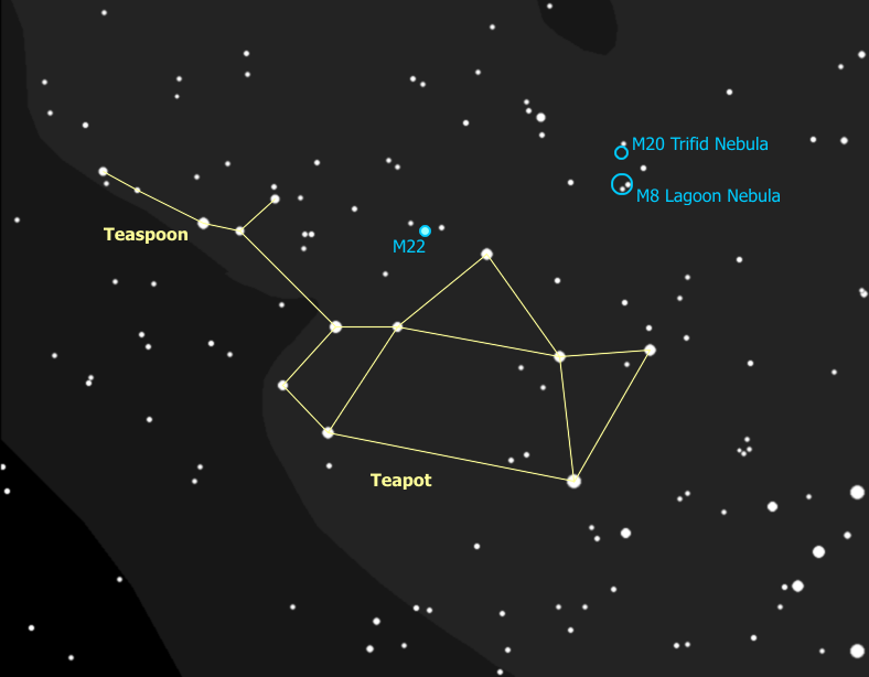 from there, you will come across the Lagoon Nebula (M8) and then the Trifid