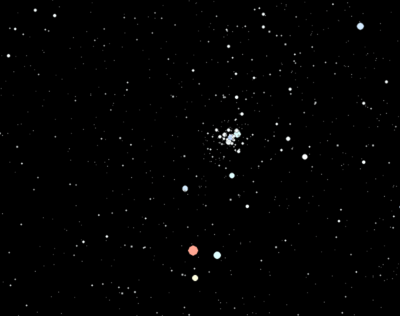 M6 is sometimes called the "Butterfly Cluster" because it looks like a butterfly with its wings open (flying toward the Northwest). Can you see it in the telescope? You may even be able to spot the butterfly's antennae. Can you spot the orange giant among the hot blue stars? M7 is more spread out (it's closer) - it can be seen perfectly well with binoculars and can even be spotted with the unaided (sharp) eye.