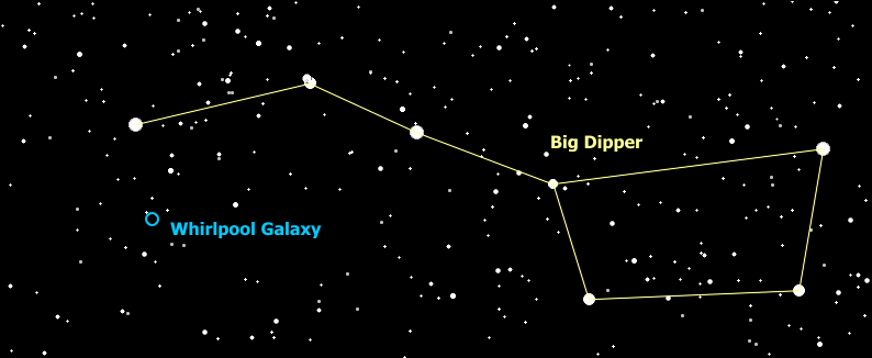 This region of interesting galaxies sweeps all the way up to the Big Dipper, and all the way down to Corvus the Crow. Just below the handle of the Dipper (officially in the faint neighboring constellation of Canes Venateces) is one of the coolest-looking galaxies for us to get our telescope on, The Whirlpool Galaxy.