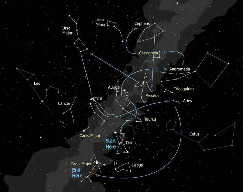 The account here is the agenda that I loosely follow in providing a guided tour of the winter skies as visible from 45° North Latitude. This tour is designed for one topic to lead to the next, so it flows nicely and still manages to teach Astronomy under the night sky as we caravan from one constellation to another. Aside from the binoculars and telescopes I usually make a point of also bringing a highly focused flashlight which serves as an effective pointer for tracing out constellations.
