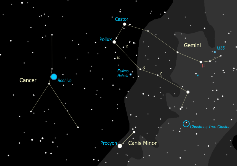 M35 is easy to see in binoculars The Christmas Tree is upside down (North is up)