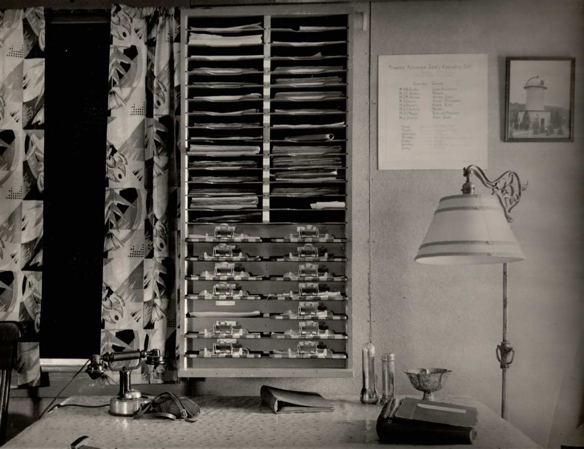 larger equipment could be stored.Above: one of only 2 known pictures of the interior of the clubhouse / monastery. It shows one corner. The above rack positions hold the AAVSO blueprint charts of variable stars to be observed by the MAS, while those below hold the clipboards of individual observers. The book at the lower right is the log book, which everyone would sign when visiting the observatory, a practice that exists to this very day. The telephone connects with a like instrument in the 2nd floor of the A-Dome.