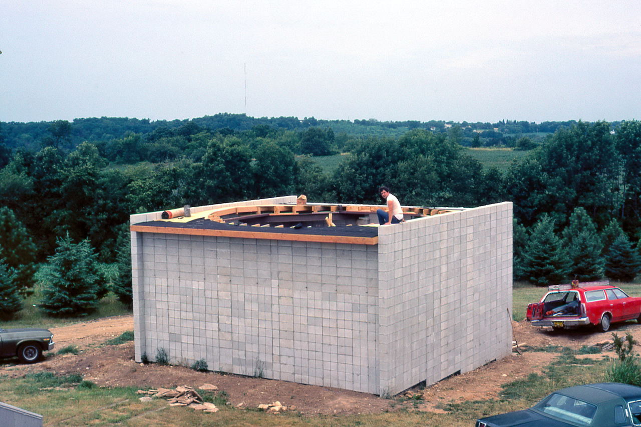 Jun 7 Samolyk, Hanson, Fanson, Asztalos, Hesseltine, Harris, Zit: Laying block. The day started with a very intense thunderstorm that could have canceled the planned day. Jim Fanson walked around with his light meter in hand and noted how dark it had become at the height of the storm. Fortunately the storm was short and work could continue that day. By the end of the day the walls were up to about 5 feet.