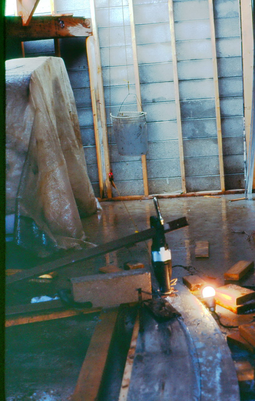 Jun 28 The first two of the four I-Beams were lifted onto the pilasters, about 14 feet from the ground. This will be one of the most dangerous jobs of the entire project. The sensible course would have been to rent a crane to lift the beams as they were incredibly heavy, but the cost would be prohibitive since there was very little money for the project in the first place. Gerry Samolyk hatched a plan to use scaffolding and cinder blocks so a minimum of 4 people would lift the beam the height of one cinder block. This would continue for a couple of blocks until the next rung of the boards could be inserted.