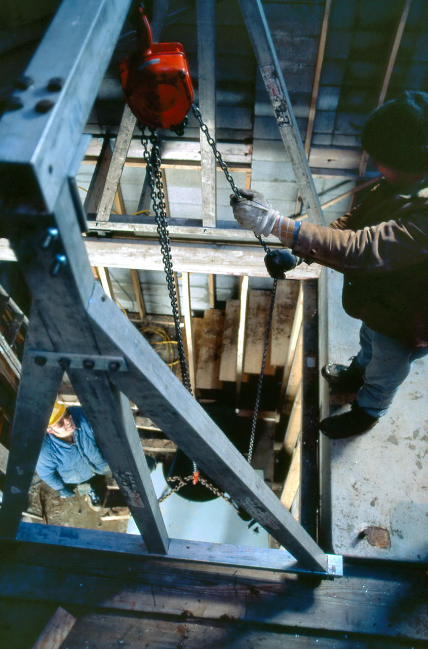 Mar 12 Samolyk, Hesseltine, J&D Smith, Ganiere, Borchardt, Smitka: Polar axis assembly is lifted onto the base.