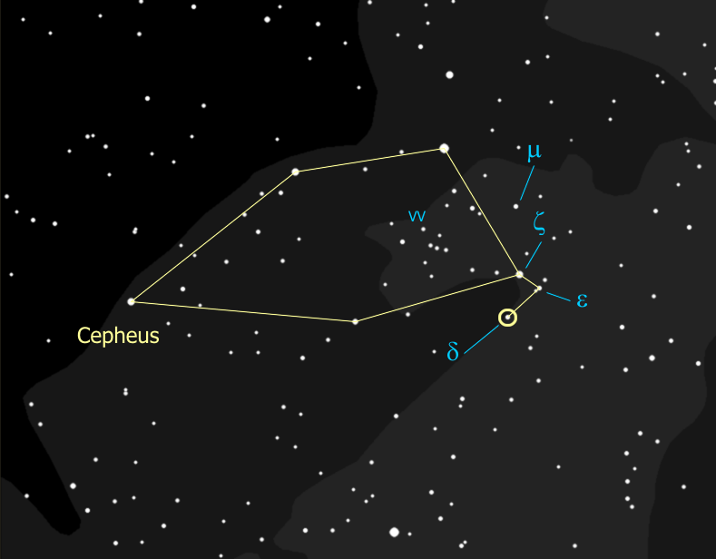 - Another star in Cepheus is of crucial importance to astronomy -- δ (Delta) Cephei. {Locate δ Cephei.} This star is a "variable", meaning the star's brightness varies over time -- in this case it varies between that of ζ (zeta) Cephei and ε (epsilon) Cephei over a period of five days. How bright is it now -- as bright as ζ, ε, or in between? We will assess again each night that we can during the week.