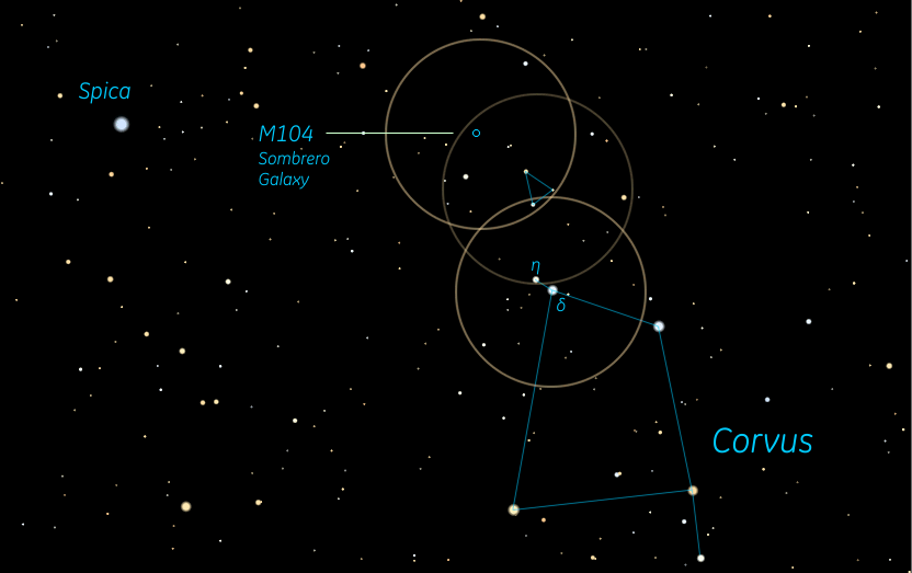 To find M104, the Sombrero Galaxy, a good place to start is with the constellation Corvus, a very conspicuous trapezoid