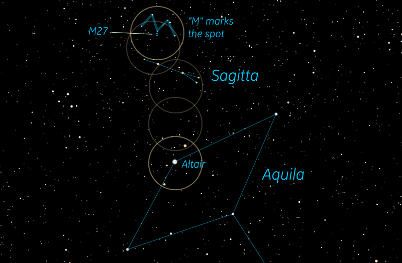 M27 To get to M27 once again begin at the star Altair in Aquila the Eagle, which you can confirm when you see
