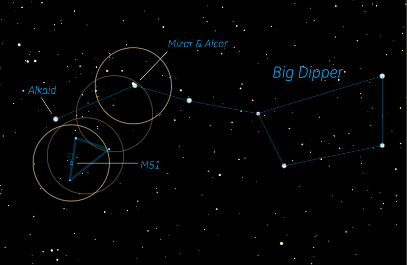 M51 For locating M51, start near the tip of the handle on the Big Dipper, and note the triangle of stars just below this star. By touching the upper left star of this triangle with the 4° circle, and just touching the line between the two left-hand stars with the ½° circle, M51 should be positioned within the ½° circle and will show up in the eyepiece.